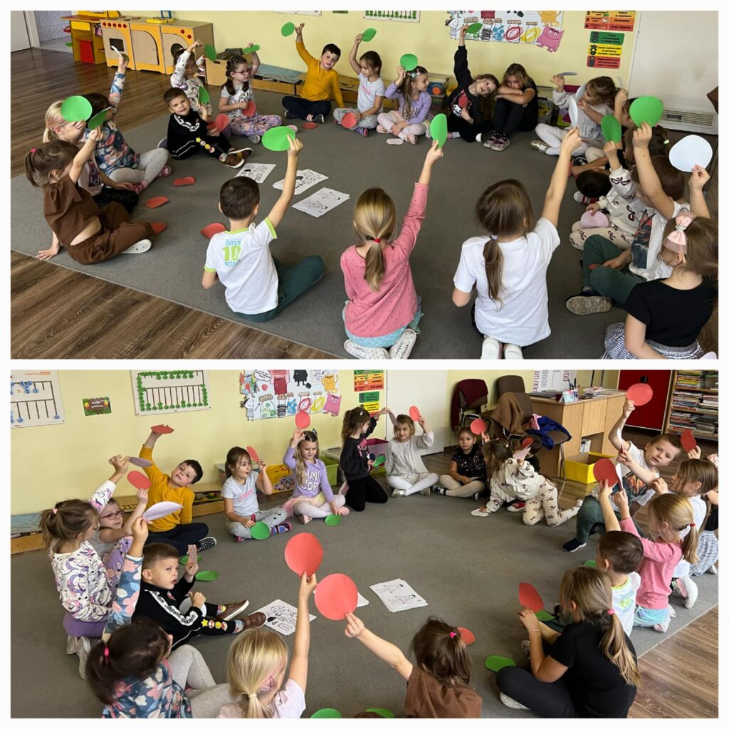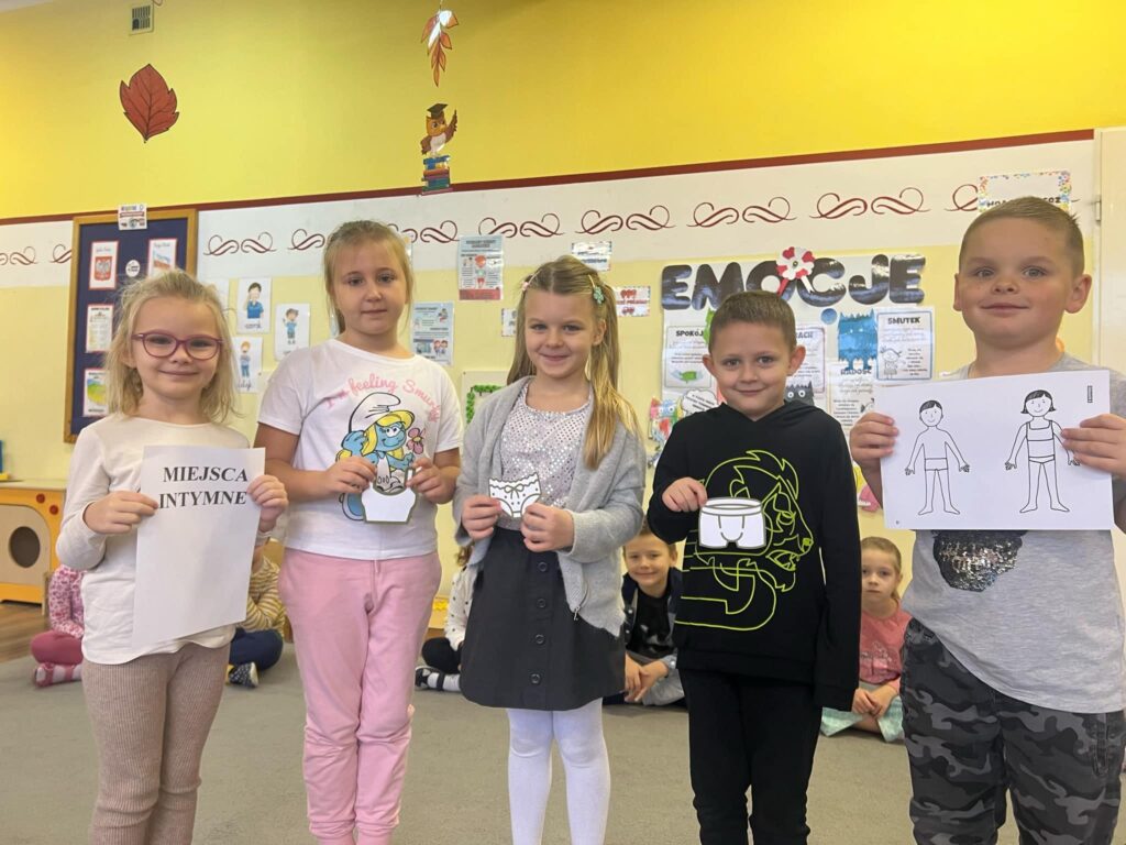 Podczas zajęć dzieci miały okazję poznać znaczenie słów „miejsca intymne” oraz zrozumieć, kto ma prawo dotykać ich ciała. Wspólnie omówiliśmy również, kiedy i w jakich sytuacjach należy zastosować trzy zasady bezpieczeństwa, aby czuć się pewnie i chronić swoje granice.