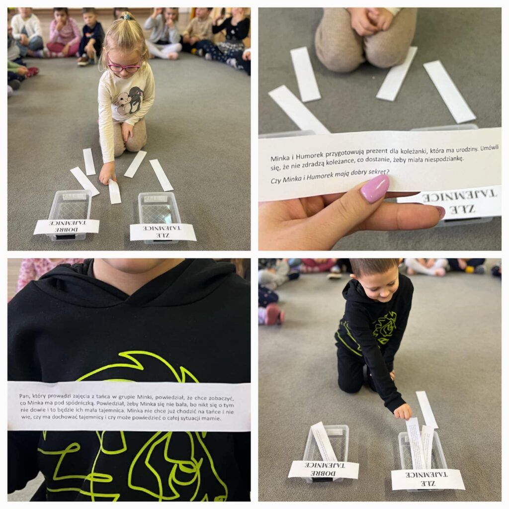 Rozmawialiśmy także o tajemnicach – dzieci uczyły się rozróżniać, które z nich są „dobre” i można je zachować, a które są „złe” i wymagają podzielenia się z zaufanym dorosłym. Dzięki temu dzieci zyskały świadomość, że mogą i powinny mówić o sprawach, które wywołują w nich niepokój lub sprawiają, że czują się niekomfortowo.