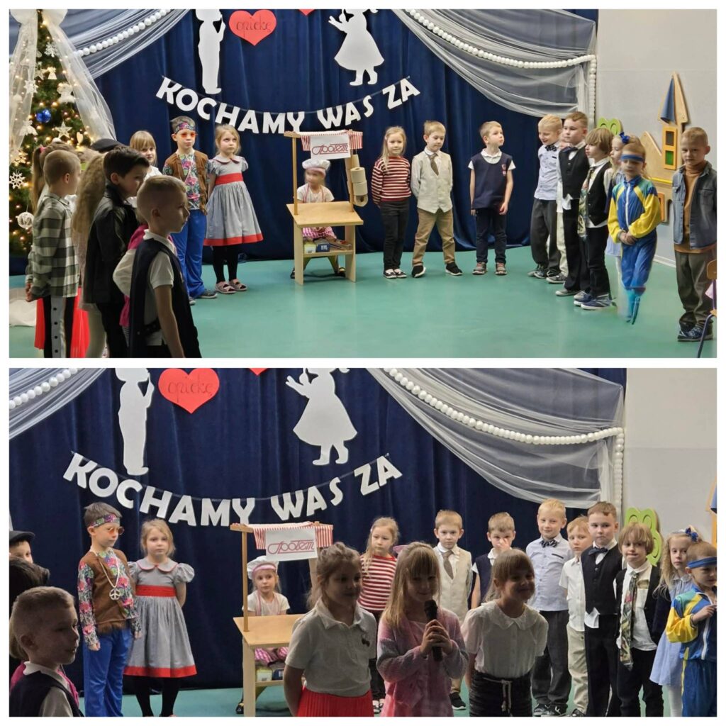Z okazji Dnia Babci i Dziadka dzieci z grupy Sówki przygotowały występ o tematyce PRL. Mali artyści w prosty i wesoły sposób pokazali, jak wyglądało życie „za dawnych lat” – były kolejki do sklepu, stare radio i zabawy bez telefonów. Dzieci wystąpiły w kolorowych strojach z epoki, śpiewały piosenki i recytowały wierszyki. Występ sprawił Babciom i Dziadkom wiele radości i wywołał uśmiech oraz wzruszenie.