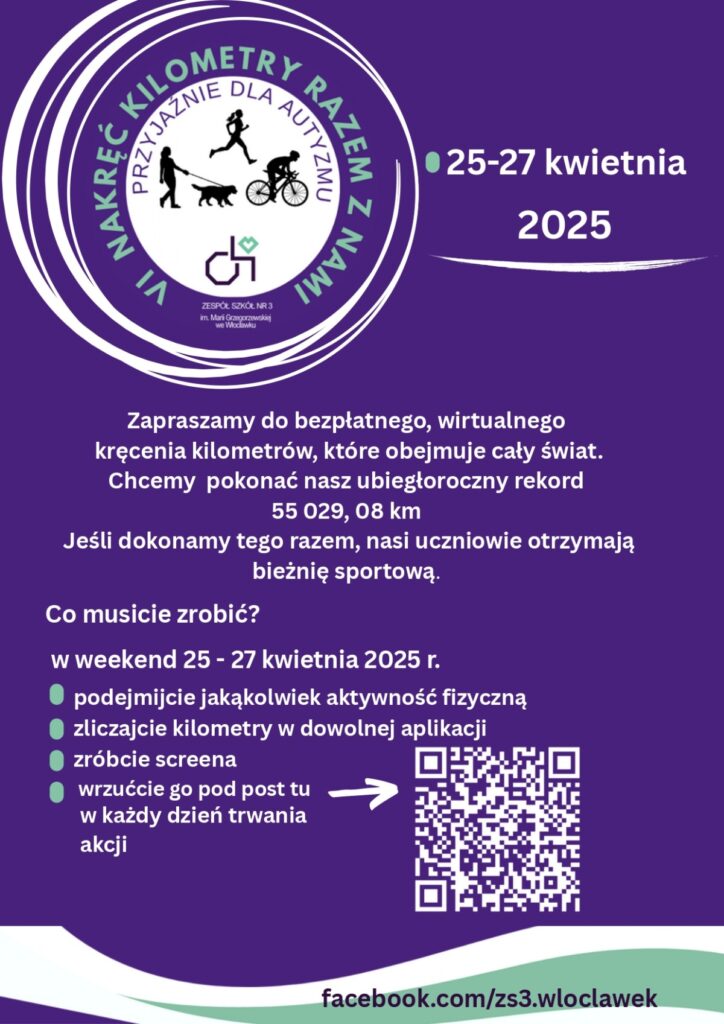 Zapraszamy do bezpłatnego, wirtualnego kręcenia kilometrów wraz z Zespół Szkół nr 3 im. Marii Grzegorzewskiej we Włocławku – organizatorem światowego przedsięwzięcia pod nazwą „Nakręć kilometry razem z Nami. Przyjaźnie dla autyzmu – VI edycja w ramach Światowego Dnia Świadomości Autyzmu”.