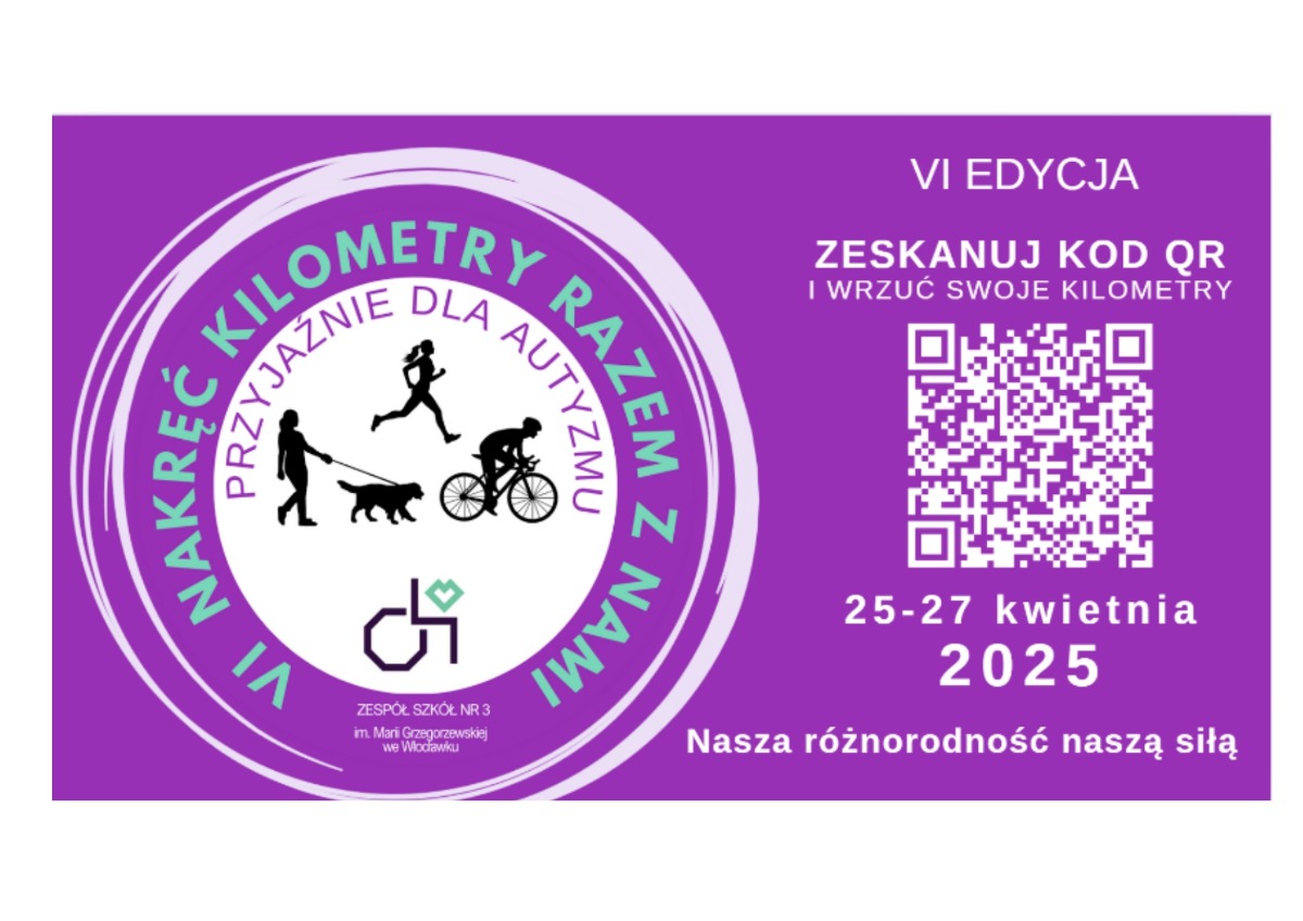 Zapraszamy do bezpłatnego, wirtualnego kręcenia kilometrów wraz z Zespół Szkół nr 3 im. Marii Grzegorzewskiej we Włocławku – organizatorem światowego przedsięwzięcia pod nazwą „Nakręć kilometry razem z Nami. Przyjaźnie dla autyzmu – VI edycja w ramach Światowego Dnia Świadomości Autyzmu”.