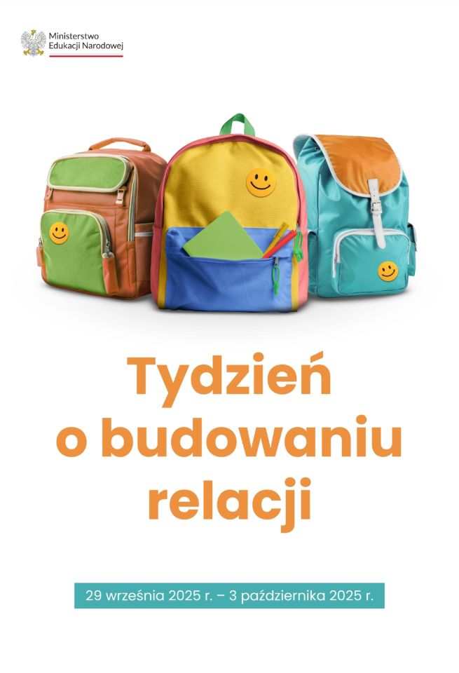 Tydzień o budowaniu relacji 29 września, 20253 października, 2025 • Przedszkole36 Od 29.09.2025r. w Naszym Przedszkolu rozpoczynamy „Tydzień o budowaniu relacji”. Dzieci z każdej grupy wezmą udział w różnorodnych zajęciach, które pozwolą wzmacniać relacje rówieśnicze, będą uczyły empatii i wzajemnego szacunku. Tydzień o budowaniu relacji