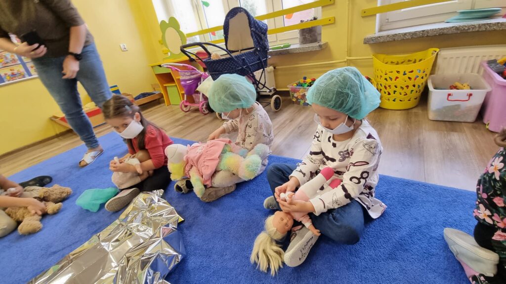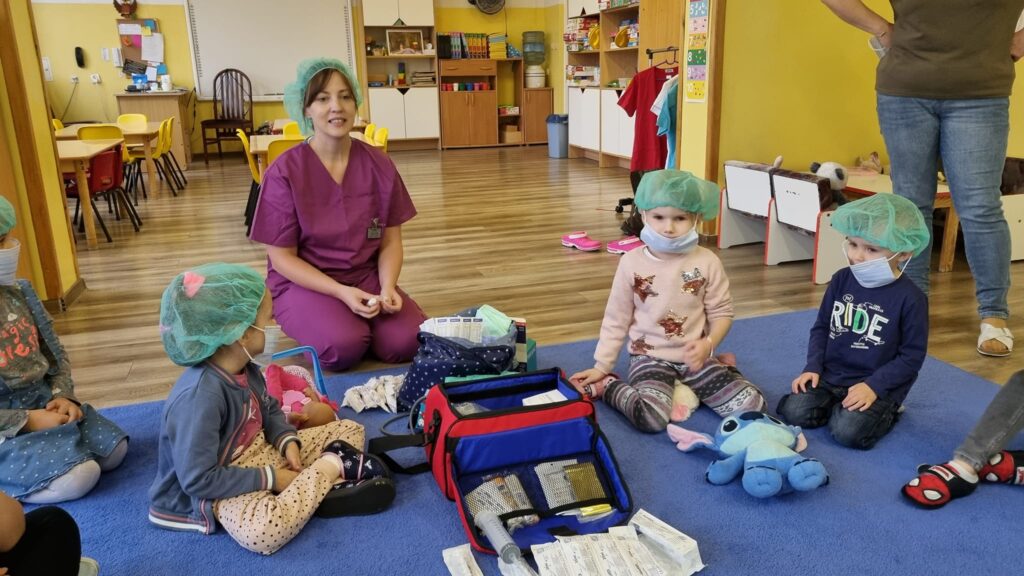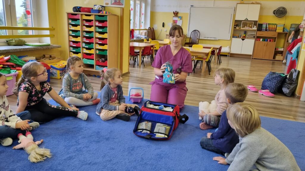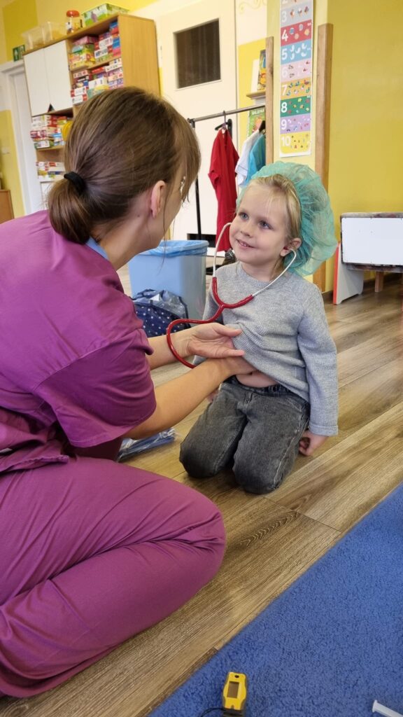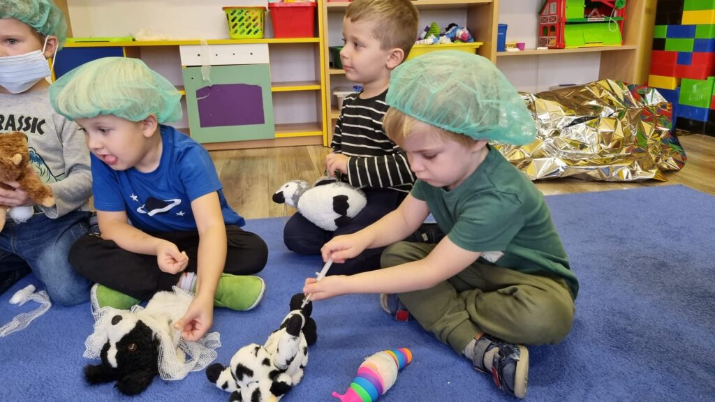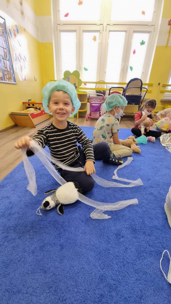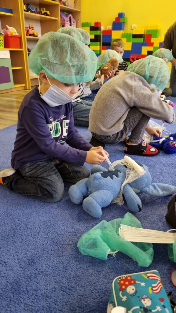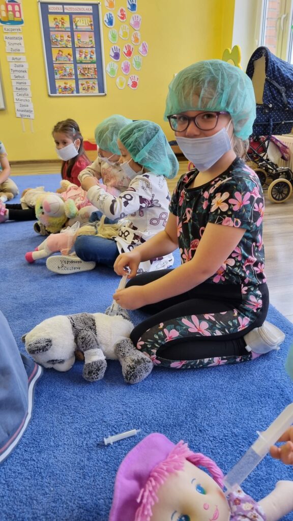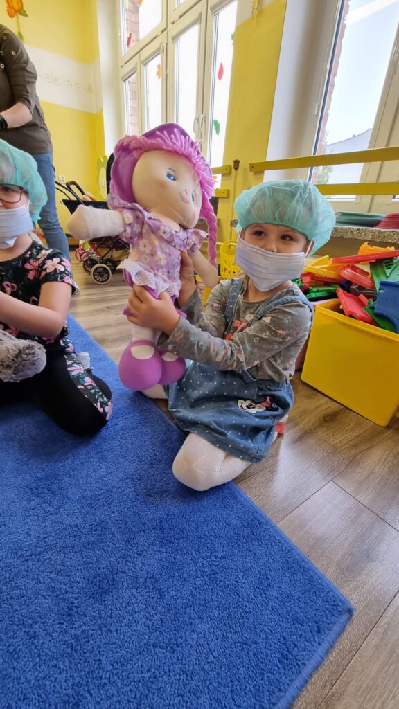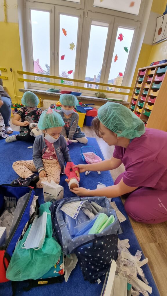 26 października 2023r. grupa I integracyjna gościła Panią Katarzynę Jędrusiak- pielęgniarkę ze Szpitala Wojewódzkiego we Włocławku. Dzieci uczyły się robić opatrunki, zastrzyki misiom, słuchały bicia swoich serduszek. Mamy nadzieję że udało się nam odczarować lęk dzieci przed lekarzem i strzykawką.